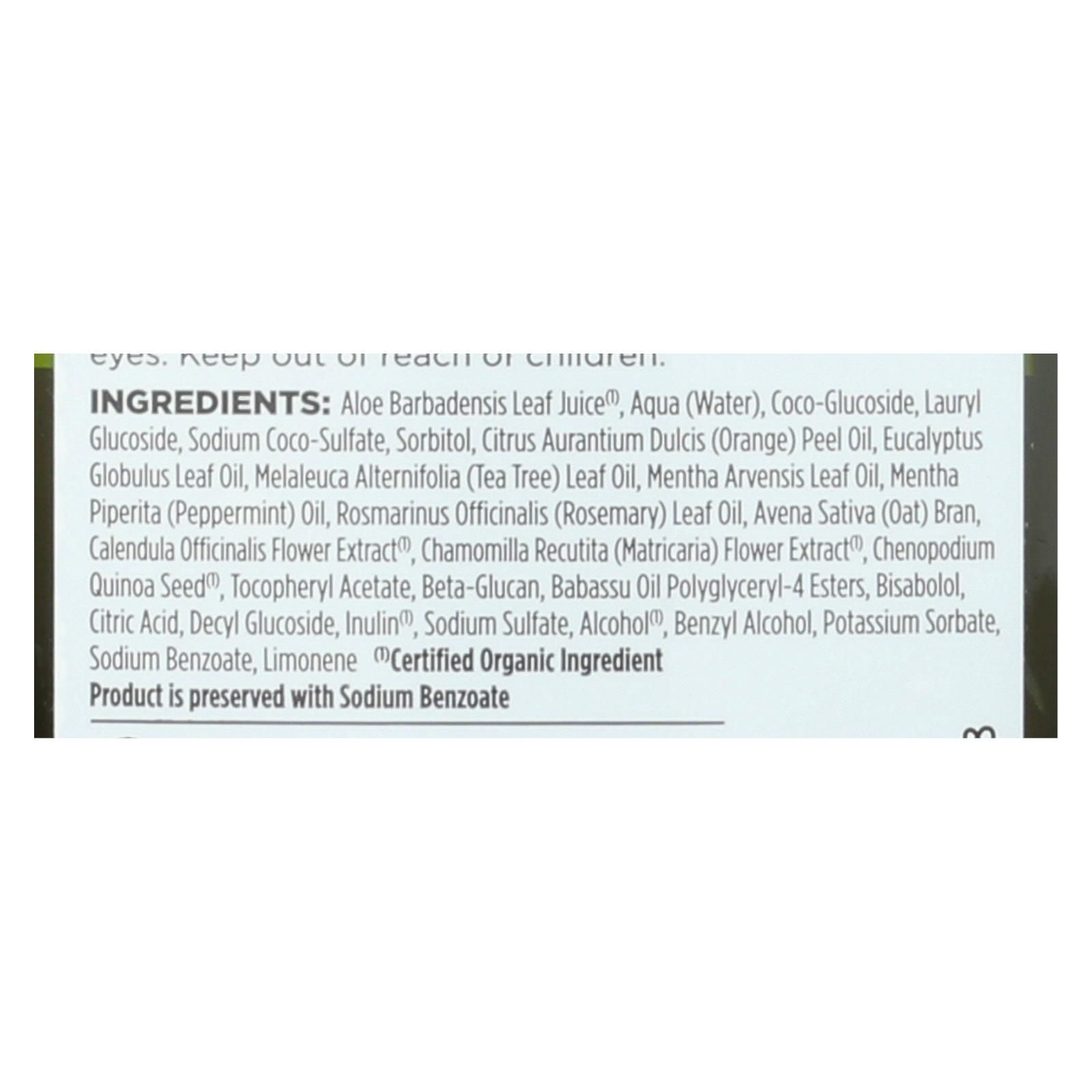 ingredients : aloe barbadensis leaf juice;¹;aqua;water;coco-glucoside;lauryl glucoside;sodium coco-sulfate;sorbitol;citrus aurantium dulcis;orange;peel oil;eucalyptus globulus leaf oil;melaleuca alternifolia;tea tree;leaf oil;mentha arvensis leaf oil;mentha piperita;peppermint;oil;rosmarinus officinalis;rosemary;avena sativa;oat;bran;calendula officinalis flower extract;chamomilla recutita;matricaria;flower extract;chenopodium quinoa seed;tocopheryl acetate;beta-glucan;babassu oil polyglyceryl-4 esters;bisabo